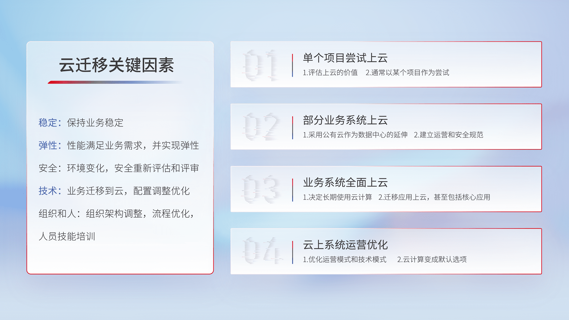 结合实际业务,,,从规划设计、、、、云平台选型、、云原生改造、、、数据迁移、、、、集成交付,,,迁移全过程为客户识别最佳上云路径,,,,做好风险识别管理,,设计网络架构、、、身份权限、、、、安全审计合规、、、、操作审计、、日志审计、、监控告警策略、、多站点容灾设计等,,对云上基础设施进行整体规划,,提升IT治理水平,,,以满足弹性、、、高可用、、高性能的需求。。。。