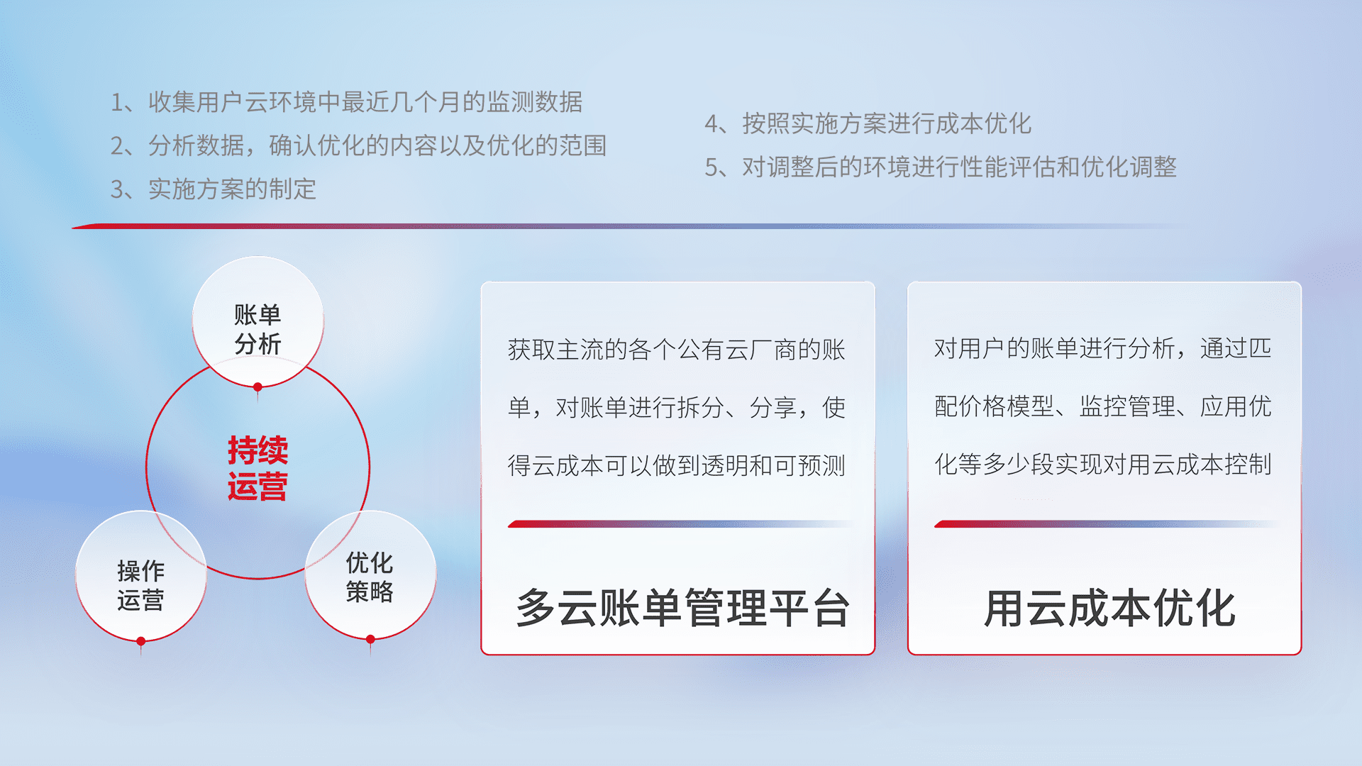 通过多云纳管,,,,以统一的资源数据模型把客户的云资源进行抽象和封装,,,进而实现对多云资源的统一操作,,,保障云资源管理的可靠性、、、、稳定性与可用性。。。量身定制化运维内容,,,配置、、开发运维、、补丁管理、、、、备份、、监控、、、、认证和访问管理、、、、审计和日常巡检等,,,保障在用云过程中的可靠度,,稳定度以及高可用率。。